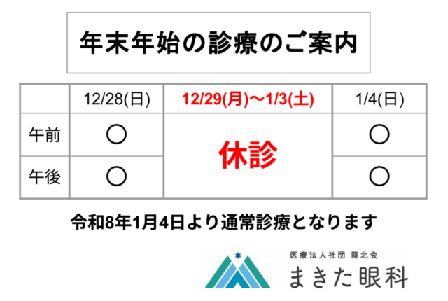 年末の診療は12月28日(日)まで、年始は1月4日(日)より診療を開始いたします。