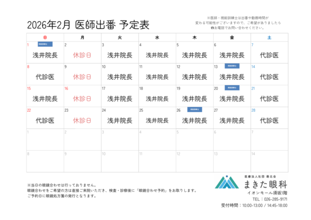 お知らせ 《2月 医師出番表のお知らせ》 当院の医師出番表をお知らせいたします。 視能訓練士出勤日:2月1日(日)、2月13日(金)、2月20日(金)、2月26日(木) よろしくお願いいたします。 ALL